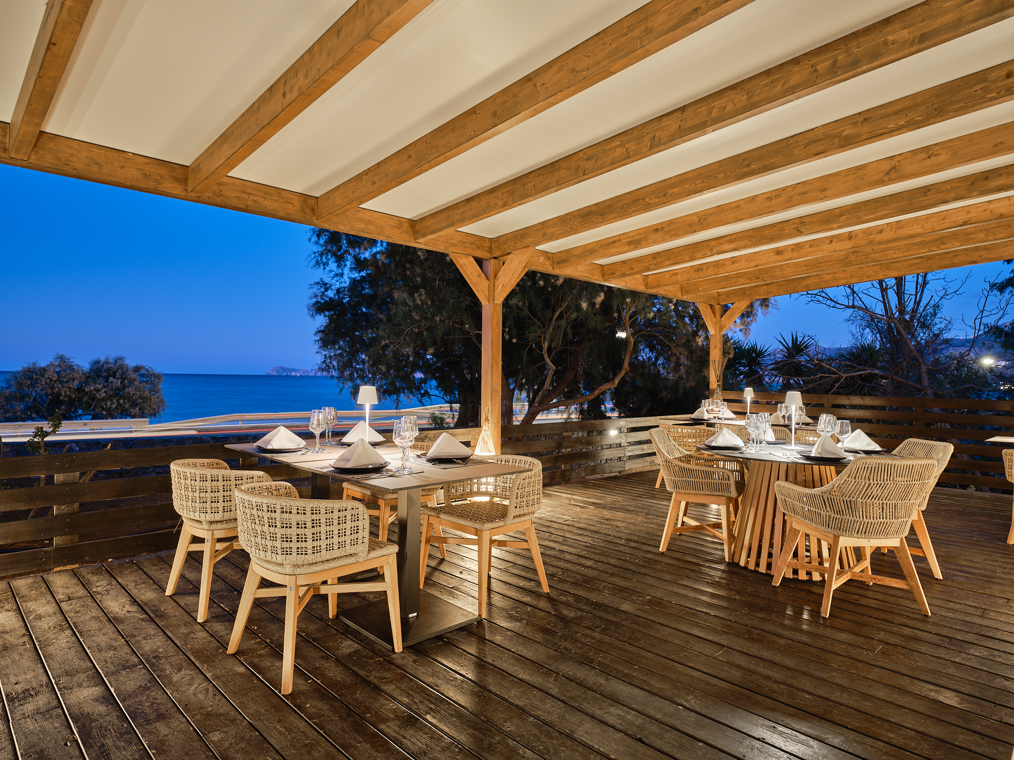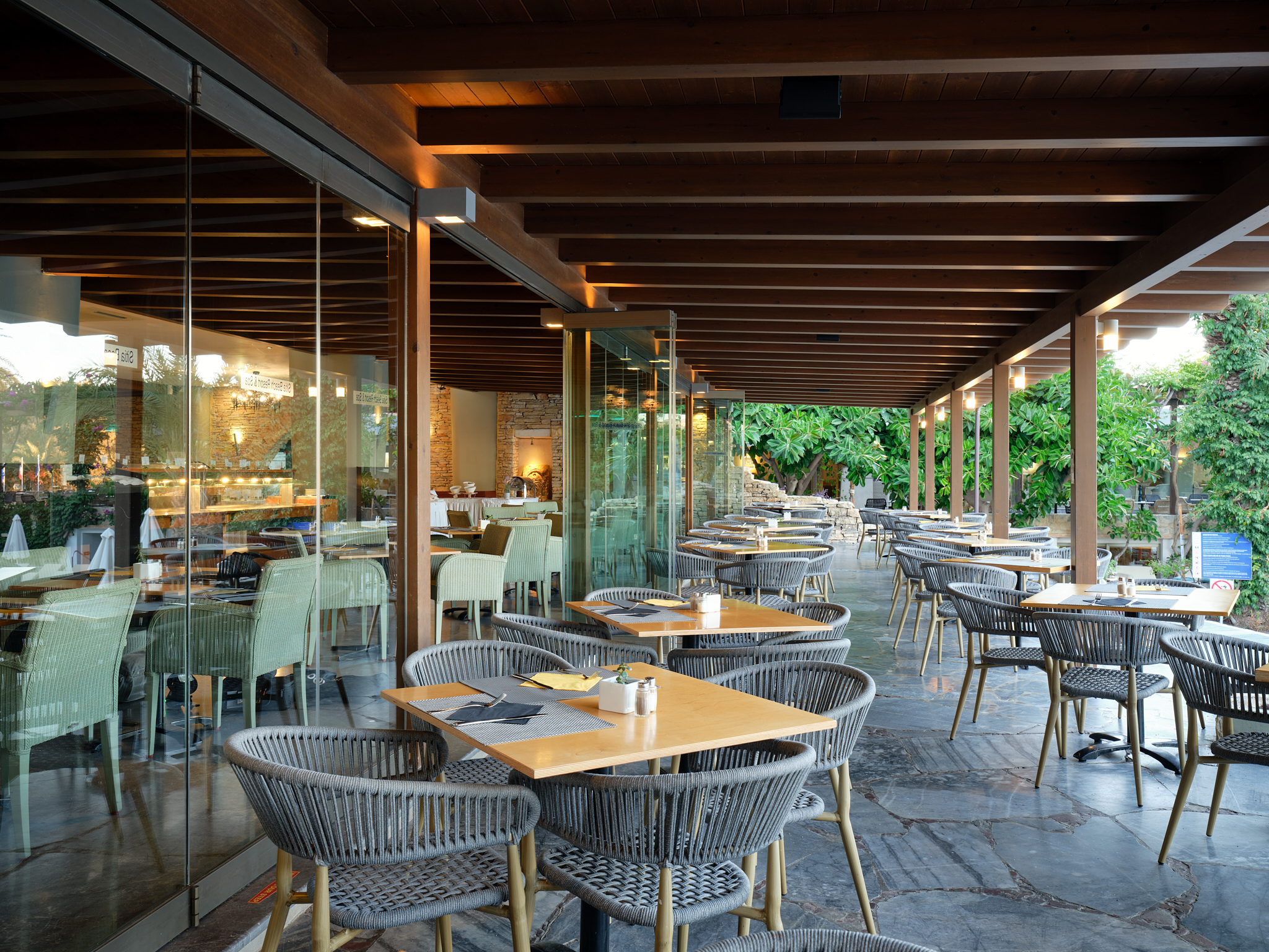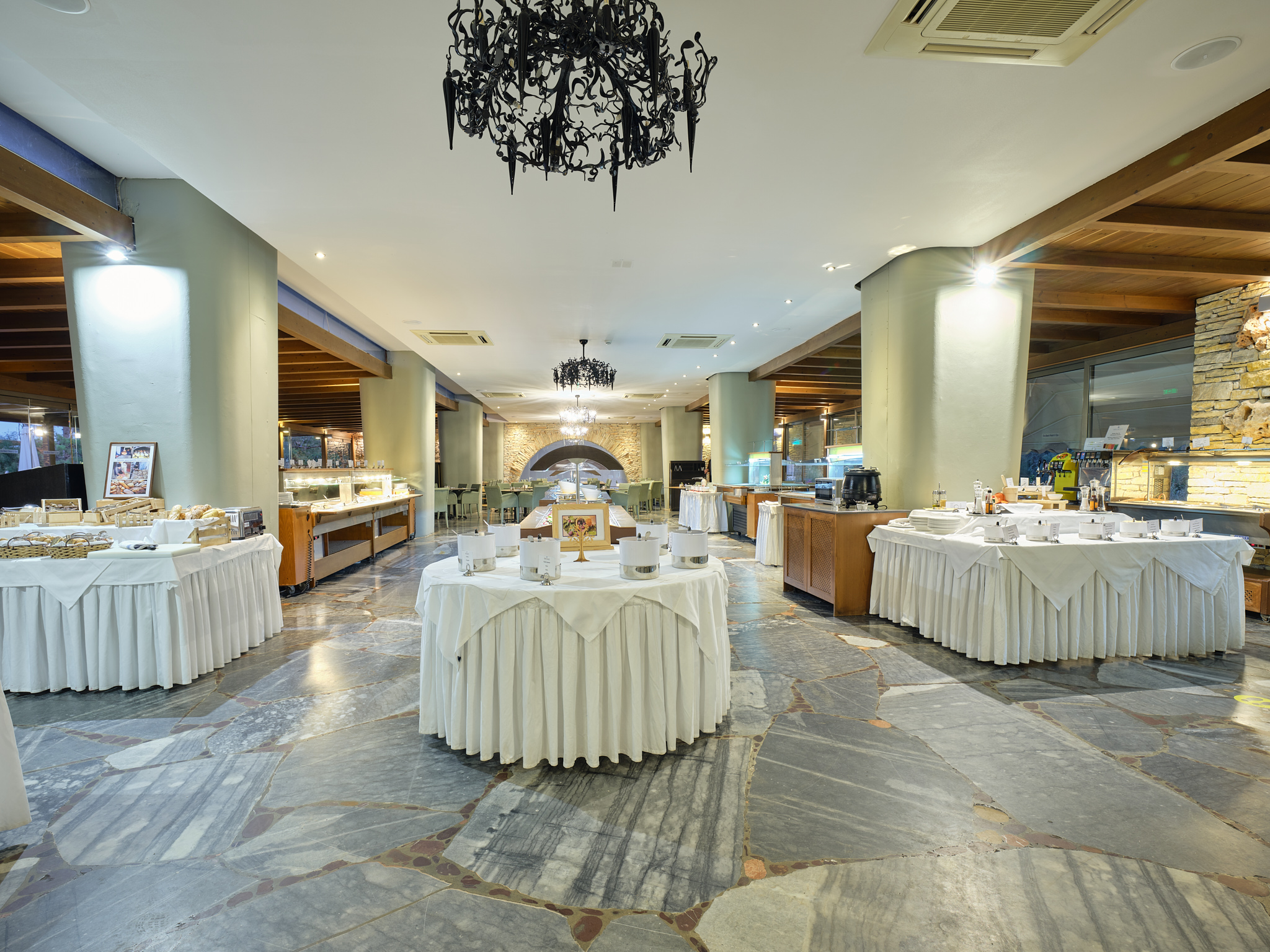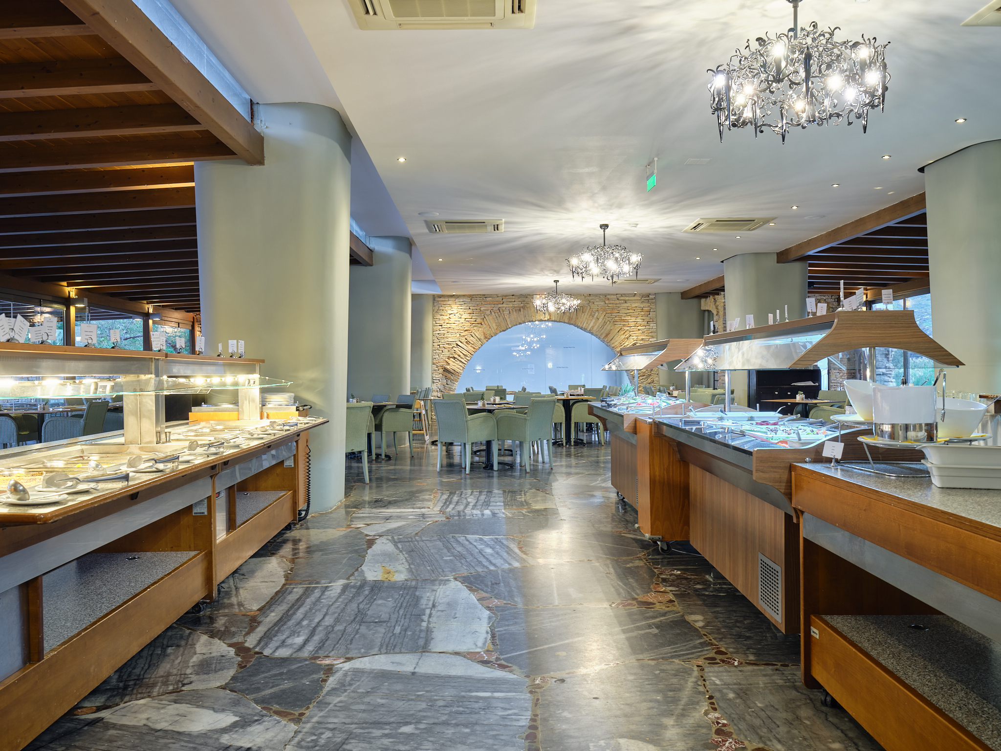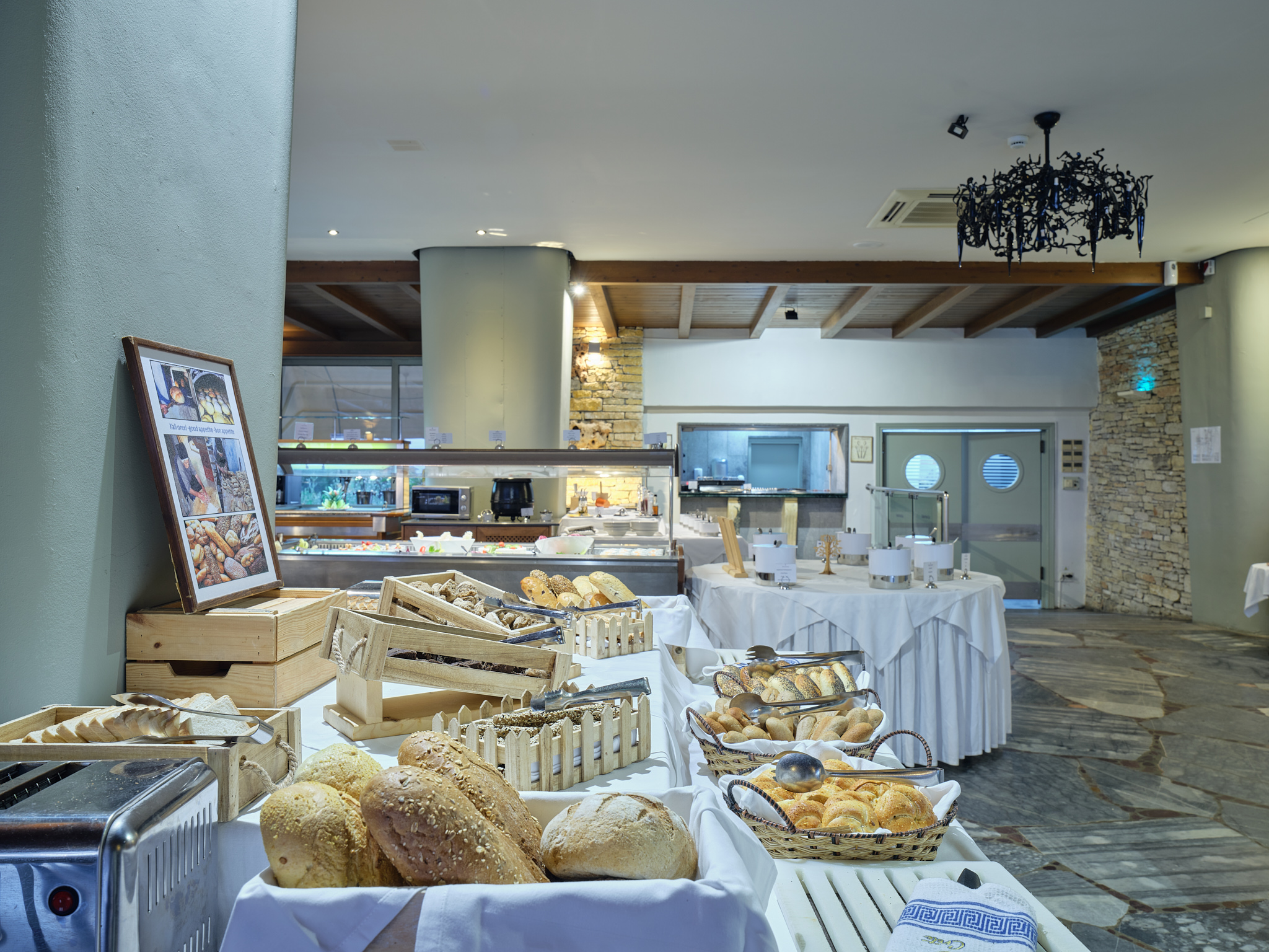Everyday you can enjoy a rich, traditional breakfast buffet. You can also visit the «Greek Breakfast» corner, which we have created especially for you, to offer you the chance to try Greek dishes and Cretan products. Our restaurant has been awarded by the Hellenic Chamber of Hotels with the certificate «Greek Breakfast». In the “Greek Breakfast” corner, among other dishes made with the wonderful Cretan flavors, you can try the Cretan “sfougato” (omelette with zucchini) or Cretan cheese, PDO Gruyere of Crete. If you are a lover of sweets, then do not miss the chance to taste the home made sweet delights covered with syrup that most guests like very much.